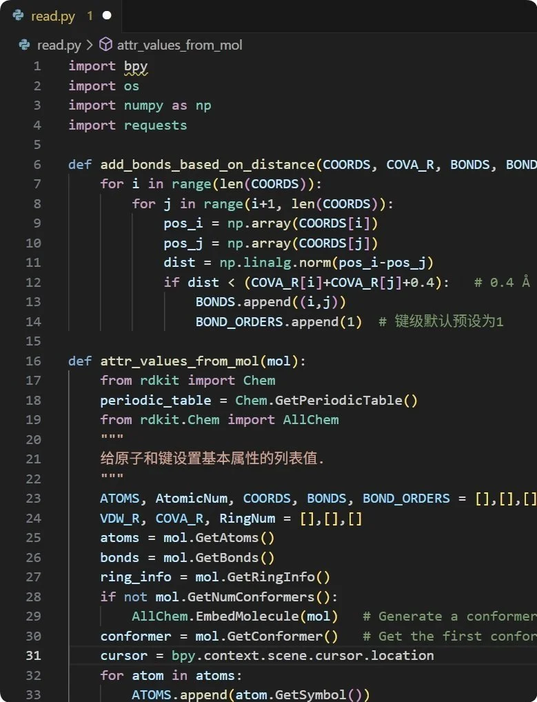 In our work, we frequently need to create 3D models of molecules, crystals, and other micro- or nanoscale materials. This is especially true for crystal structures and proteins. The conventional approach typically involves building models in specialized scientific software, exporting them to standard 3D file formats, and then importing those into general-purpose 3D software. However, this workflow often results in the loss of structural information, significant increases in file size, and difficulties in subsequent editing—ultimately limiting overall efficiency. The idea of directly generating 3D structures from raw scientific data within Blender emerged in response to these challenges.