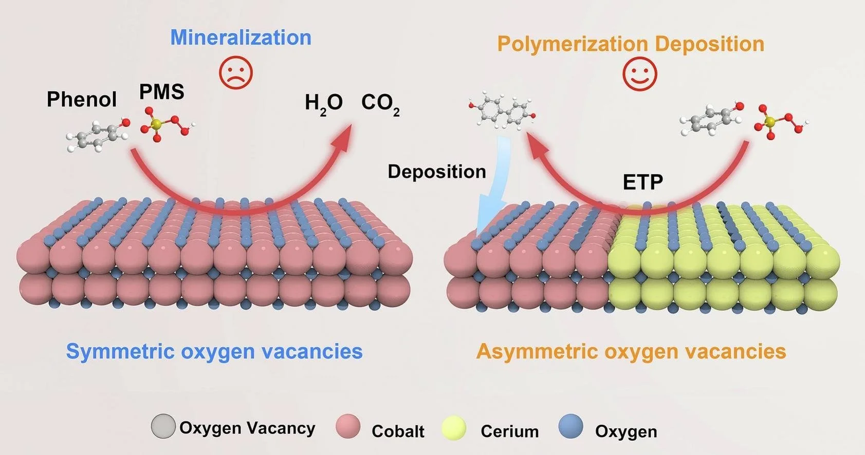 Polymerization–deposition (PD) pathway offers a promising route for low-carbon wastewater treatment, yet their efficiency under ultra-low oxidant dosage remains challenging. Herein, interfacial asymmetric oxygen vacancies (As-Ov) were constructed in hollow Co3O4/CeO2 composites (H-Co30Ce-Ov) using glucose-derived hydrothermal carbon microspheres as sacrificial templates. The interfacial As-Ov drives an electron-transfer pathway (ETP) for phenol (PN) removal via peroxymonosulfate (PMS) activation to generate phenoxy radicals. These radicals subsequently underwent coupling reactions to form oligomeric products, resulting in effective COD removal via a PD-dominated process under ultra-low PMS dosage. Mechanistic investigations, including in situ Raman and electrochemical analyses, confirms the critical role of the coordination environment of As-Ov in controlling PMS activation behavior and reaction kinetic. Moreover, the H-Co30Ce-Ov exhibited excellent catalytic activity toward electron-rich pollutants, high PMS utilization efficiency and good stability across different water matrices.