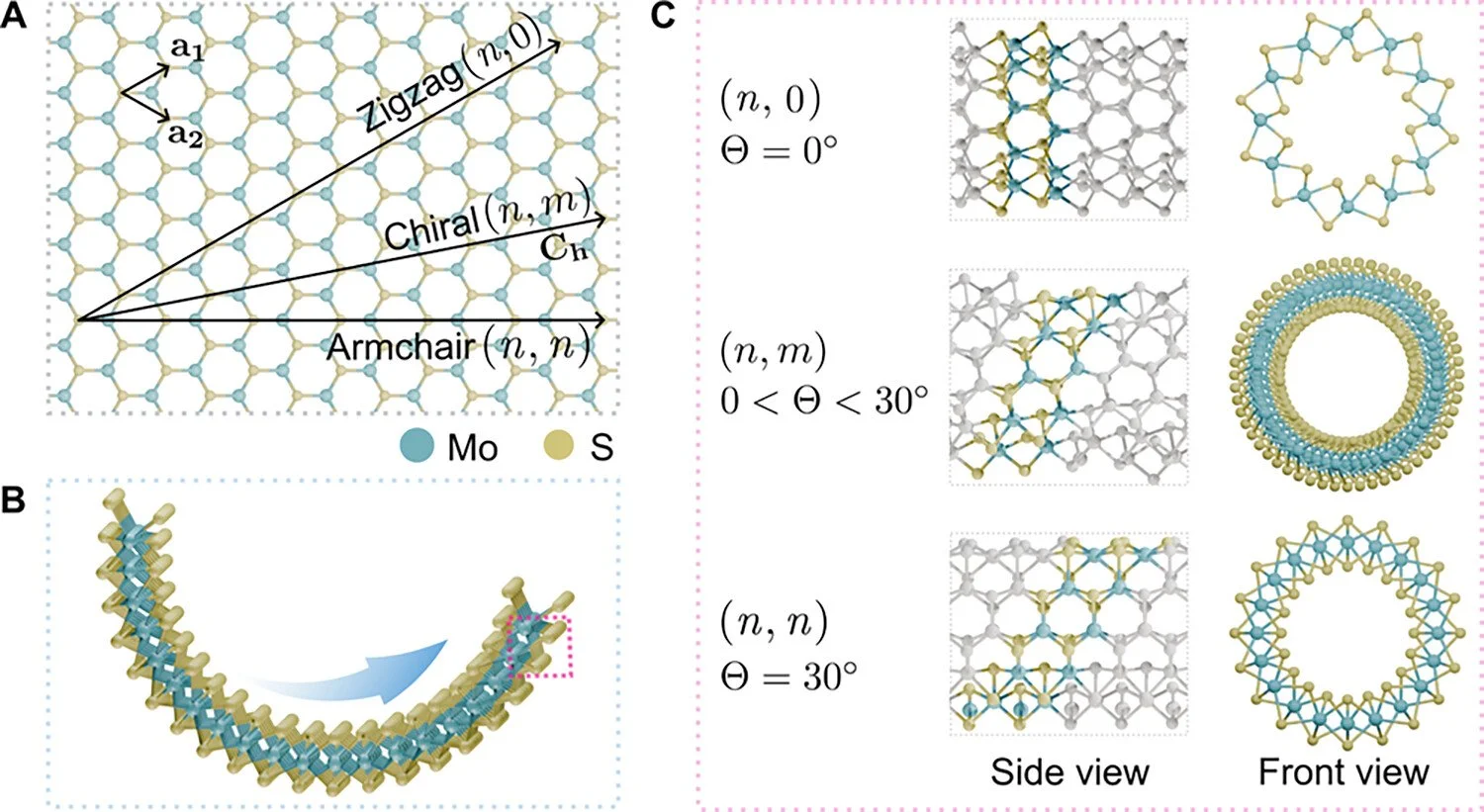 Similar to carbon nanotubes, MoS₂ nanotubes can also adopt zig-zag, arm-chair, and chiral structures, depending on the rolling direction of the MoS₂ layers, which significantly influence their electronic and mechanical properties.
